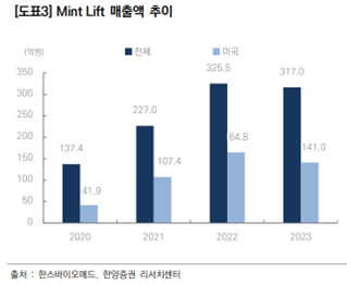 사업보고서에 따르면 Mint Lift의 매출액은 2020년(22기) 137.4억원에서 2023년(24기) 317억원으로 3년간 130.7% 성장하였으며, 같은 기간 미국 매출액은 41.9억원에서 141억원으로 236.8% 상승하여 매출액 상승에 크게 기여하였다.